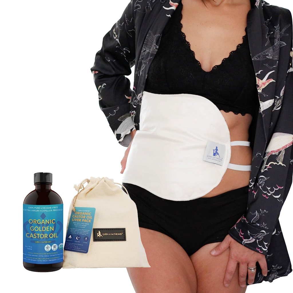 Before embarking on this rejuvenating journey, gather all the necessary supplies. You’ll need high-quality, cold-pressed castor oil, a soft piece of cloth like flannel or cotton (I prefer the organic cotton Queen of Thrones Castor Oil Packs, see below), plastic wrap or a plastic bag, a heating pad or hot water bottle, and an old towel to protect your surfaces.