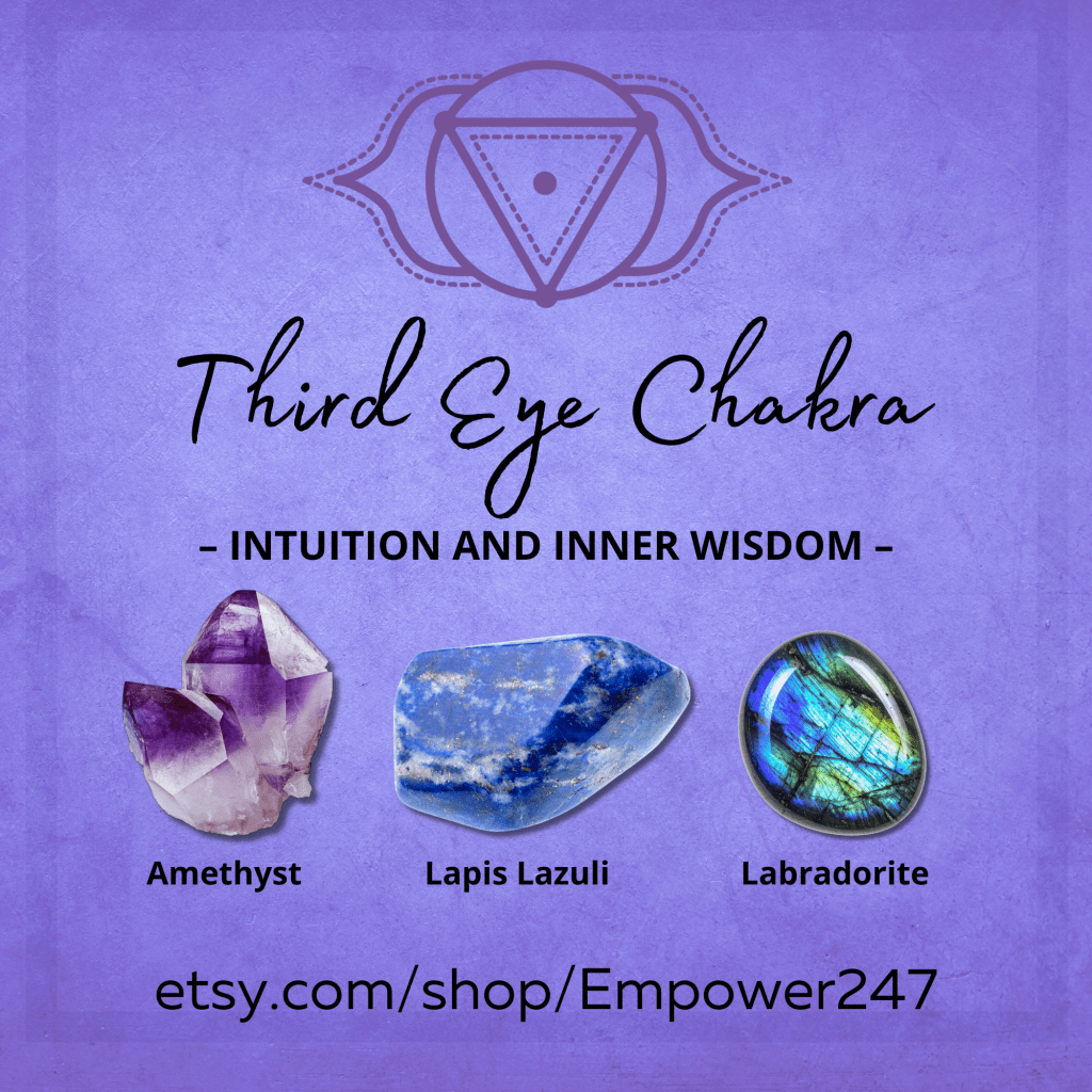 The Third Eye governs intuition, perception, and inner wisdom. Balance brings clarity and trust in your inner voice.