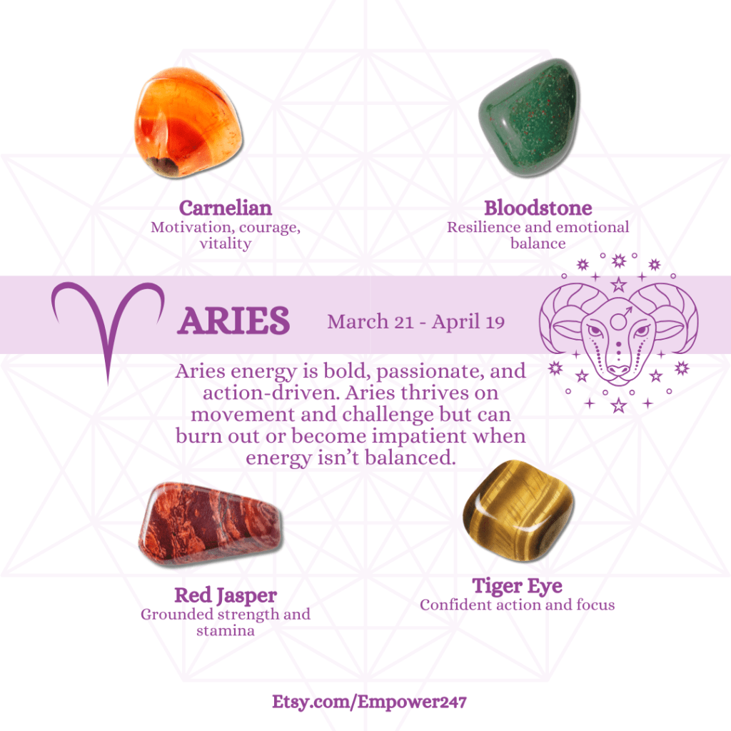 Aries energy is bold, passionate, and action-driven. Aries thrives on movement and challenge but can burn out or become impatient when energy isn’t balanced.