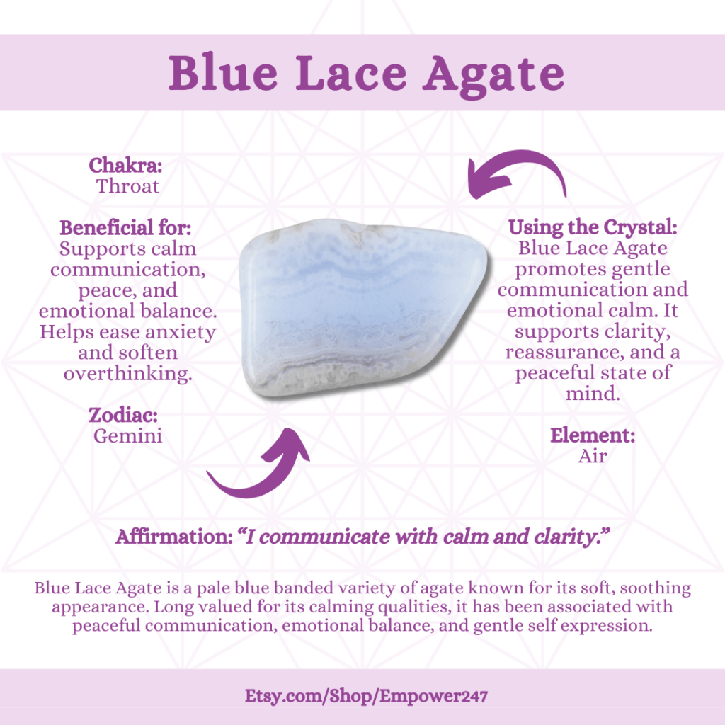 Blue Lace Agate feels gentle but deeply supportive. It reminds you that you do not have to raise your voice to be powerful.