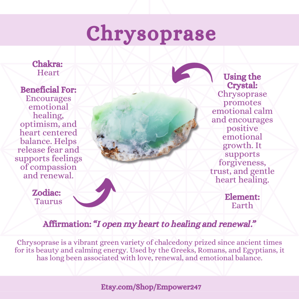 If you are entering a new relationship, rebuilding self trust, or stepping into a more heart-centered version of yourself, Chrysoprase supports emotional renewal.