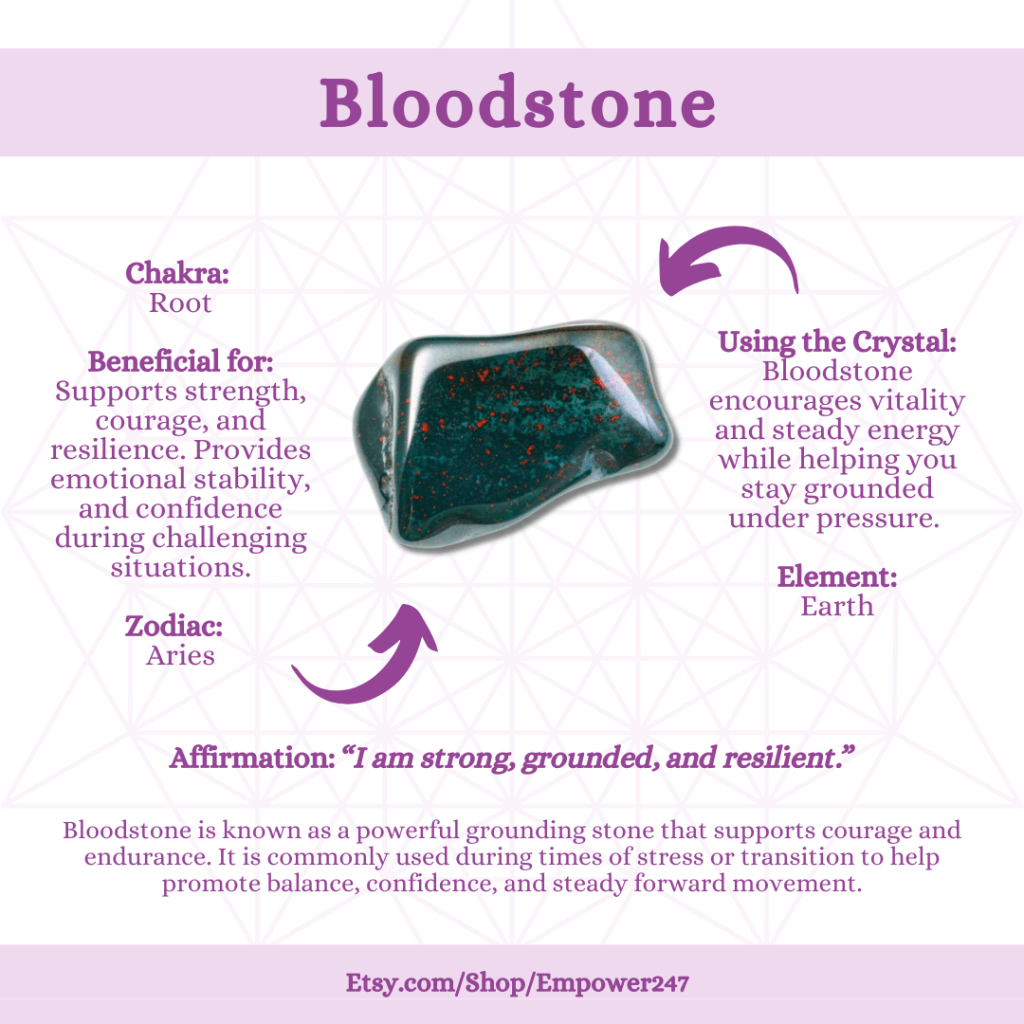 If you are stepping into a challenge or rebuilding your confidence, Bloodstone supports you like a steady inner warrior.